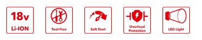Κινητήρας χωρίς ψύκτρες για 30% μεγαλύτερη ισχύ και 10 φορές μεγαλύτερη διάρκεια ζωής. Εύκολη εξαγωγή σπαθόλαμας με ένα κουμπί. Το περιστρεφόμενο στήριγμα κοπής εφαρμόζει με τον καλύτερο τρόπο στο κατεργαζόμενο τεμάχιο. Οδηγός με εξισορρόπηση κραδασμών για ξεκούραστη εργασία.