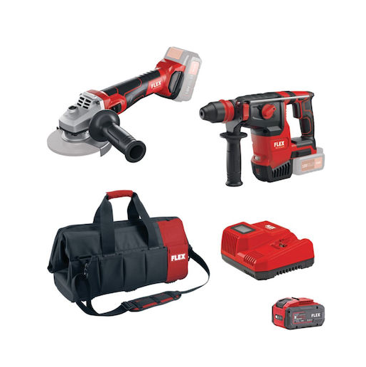 Περιλαμβάνει περιστροφικό πιστολέτο 18V, γωνιακό τροχό 18V, μια μπαταρία 8Ah, φορτιστή μπαταρίας με οθόνη LED και υφασμάτινη βαλίτσα-εργαλειοθήκη.