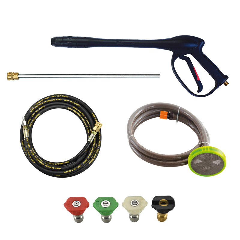 Περιλαμβάνονται στη συσκευασία: πιστόλι με σκανδάλη ασφαλείας, κάνη, λάστιχο υψηλής πίεσης 8m, σωλήνα αναρρόφησης απορρυπαντικού, ακροφύσια (0°, 25°,40° και μπεκ απορρυπαντικού), ακροφύσιο σύνδεσης νερού και φίλτρο εισαγωγής νερού.